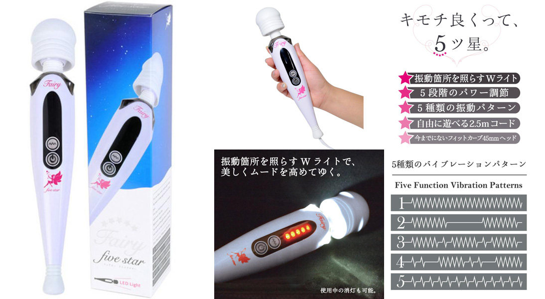 The Fairy has become the standard of the dendou massager (denma) vibrator genre but that doesn't mean the makers don't keep on trying to update and improve it. The FAIRY five starsis the latest in this best-selling line of vibes and promises to be a mega hit. It features five types of vibration patterns and five power settings that can be controlled with the simple twin buttons, leaving your mind free to enjoy buzzing her with the powerful massager head, which is the ideal size for various widely available attachments. The denma also lights up beautifully, making it really fun to use at night in the dark.