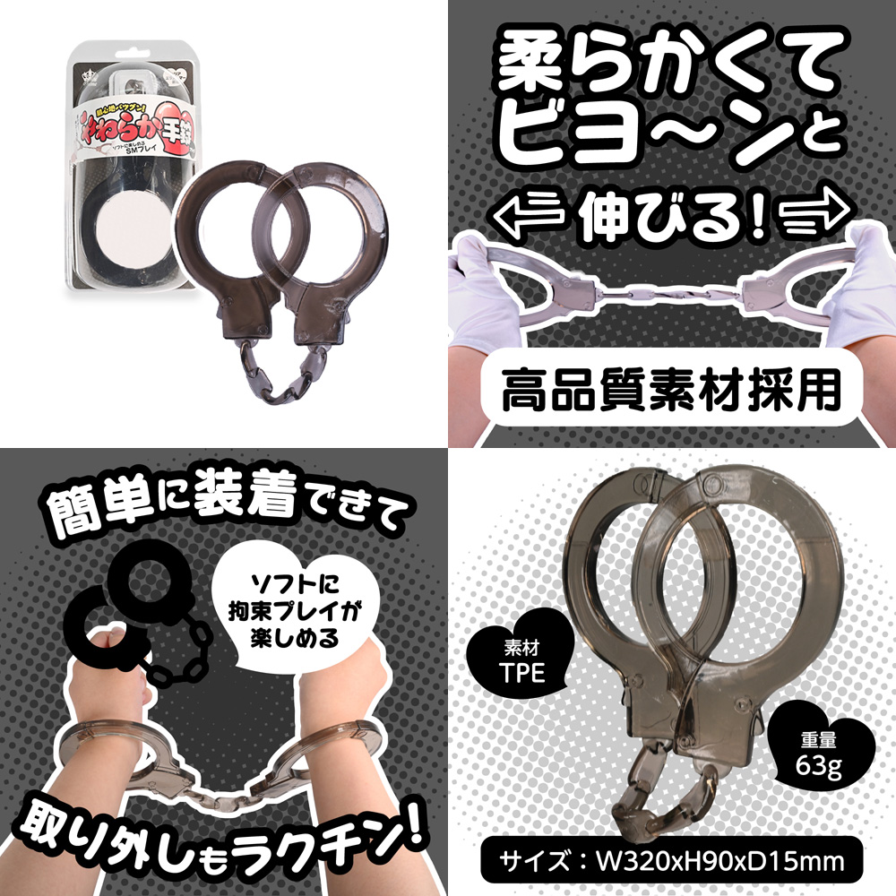 柔らかくてビヨーンと伸びるゴム素材のソフトSMにピッタリの手錠型手枷です。