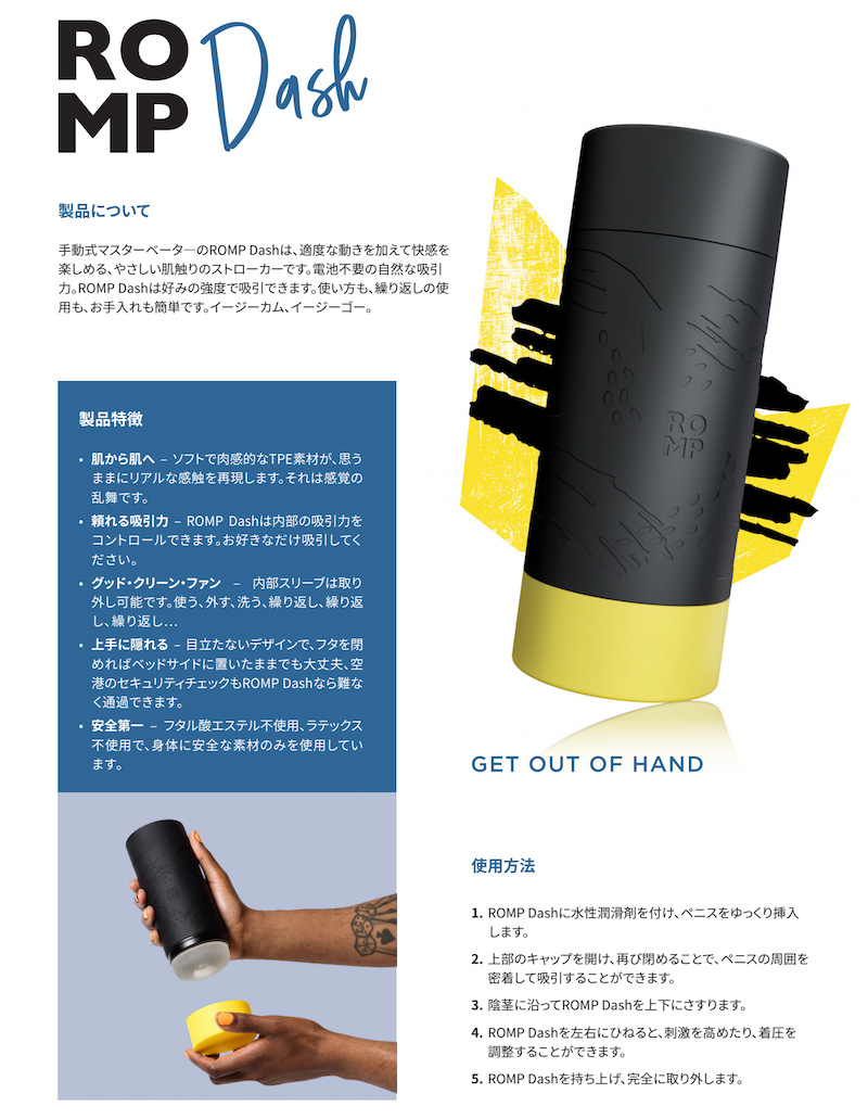 手動式マスターベーターのROMP DASHは、適度の動きを加えて快感を楽しめるやさしい肌障りのストローカーです。