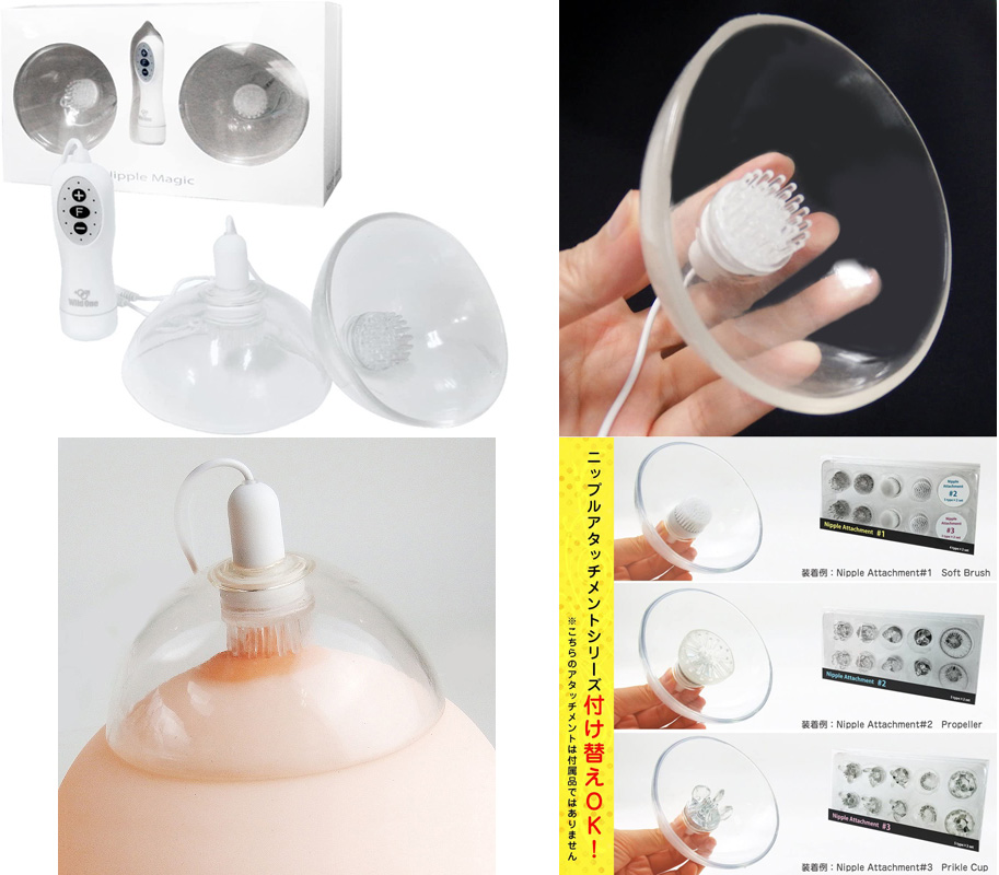 乳房に吸い付いてフィットする透明なソフトカップで固定して、先端ブラシの回転でピンポイント責め♪