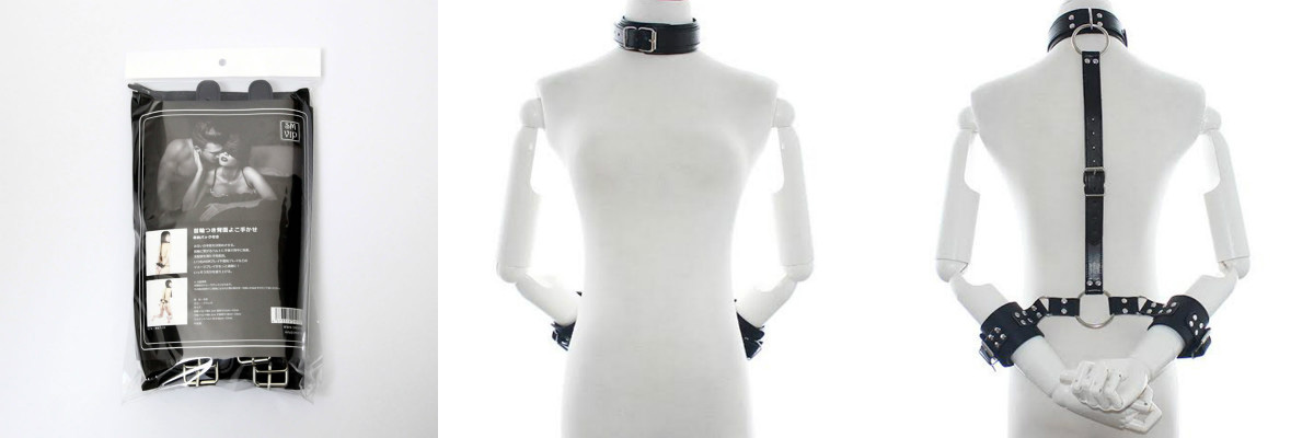 首輪に繋がるベルトに手枷で背中に拘束、支配欲を満たす拘束具。