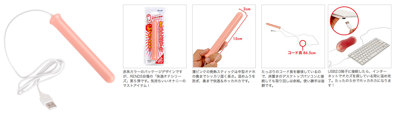 USB2.0端子(500mA)に接続するだけでスティックが発熱。お手持ちのオナホールに挿し込むことで、内部をホッカホカに温められる、簡単&便利なオナホアメニティです。