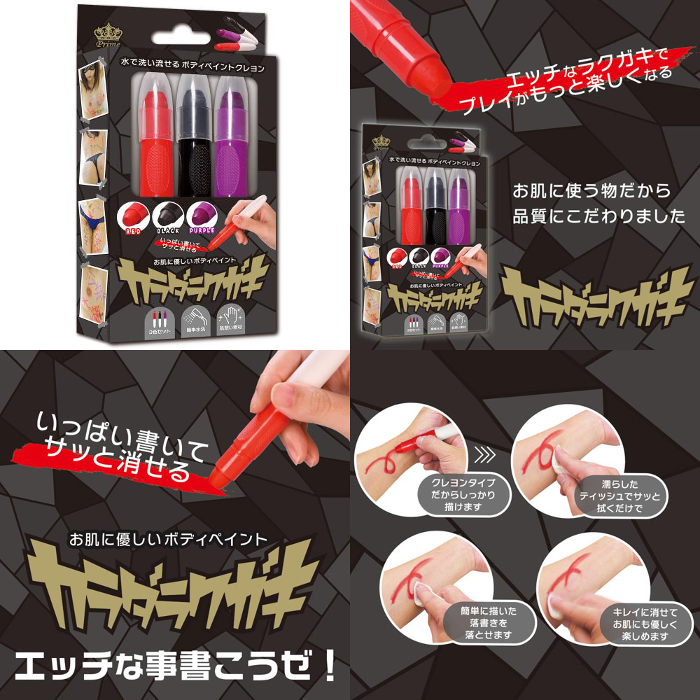 水で簡単に流して消せる、ボディペイントクレヨン「カラダラクガキ」がお得な3本セットになってリニューアル!