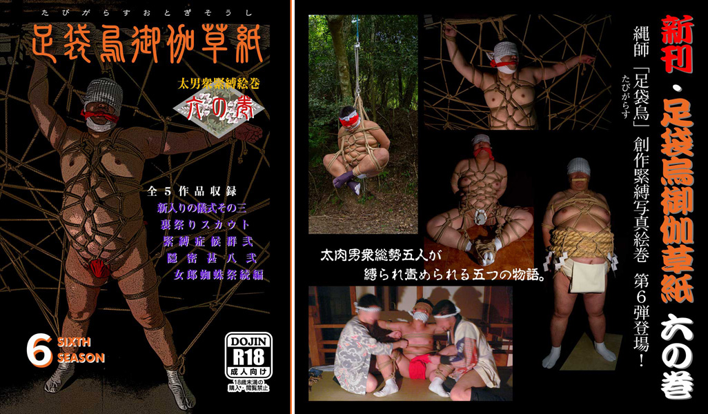 縄師「足袋烏」がデブ男衆総勢5人を麻縄緊縛した写真を基に展開される五つの物語を収録。