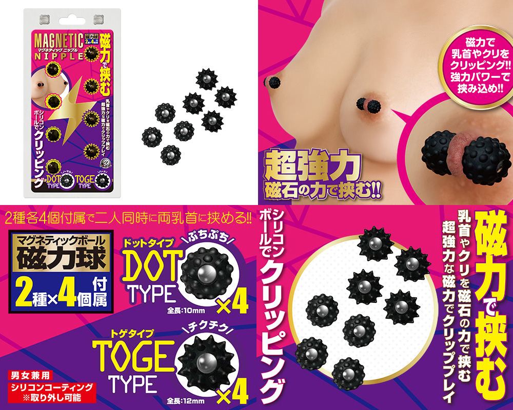 乳首やチンポの皮を磁石の力で挟む!!超強力な磁力を利用したクリッププレイが楽しめる。